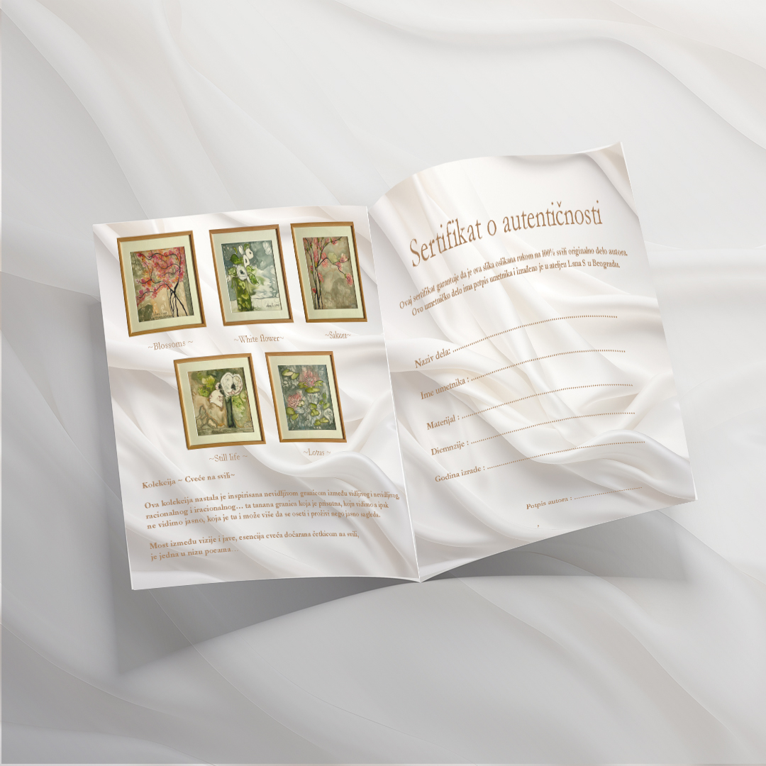 Materijal: 100% svila Originalni rad autora. Uz nju dolazi i sertifikat o autentičnosti dela. Sertifikat o autentičnosti sadrži fotografije iz cele kolekcije kao i obašnjenje kako je kolekcija nastala, nazov dela i potpis autora i garantuje orignialnost dela.
